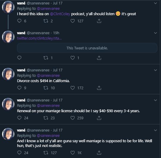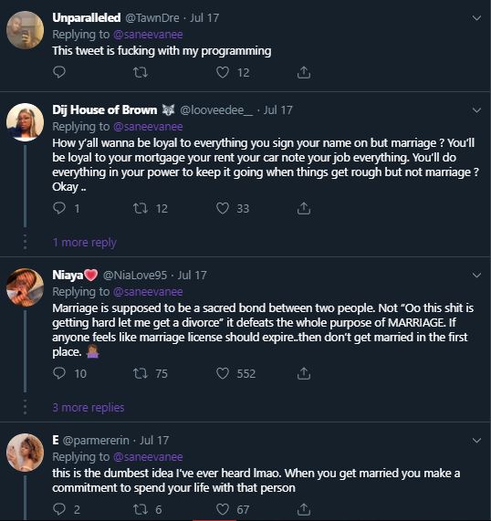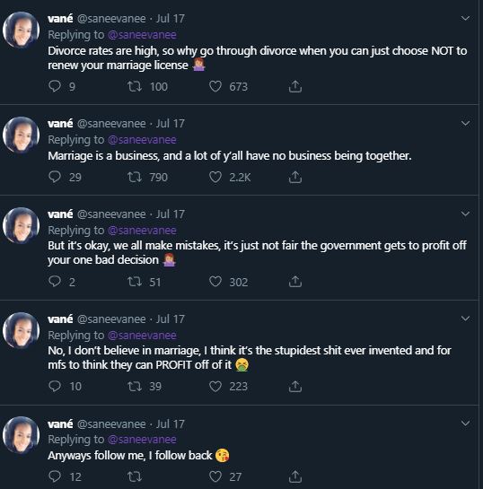 “Marriage licenses should expire like every other state license, to give people the option to part ways or renew ??♀️”, she tweeted