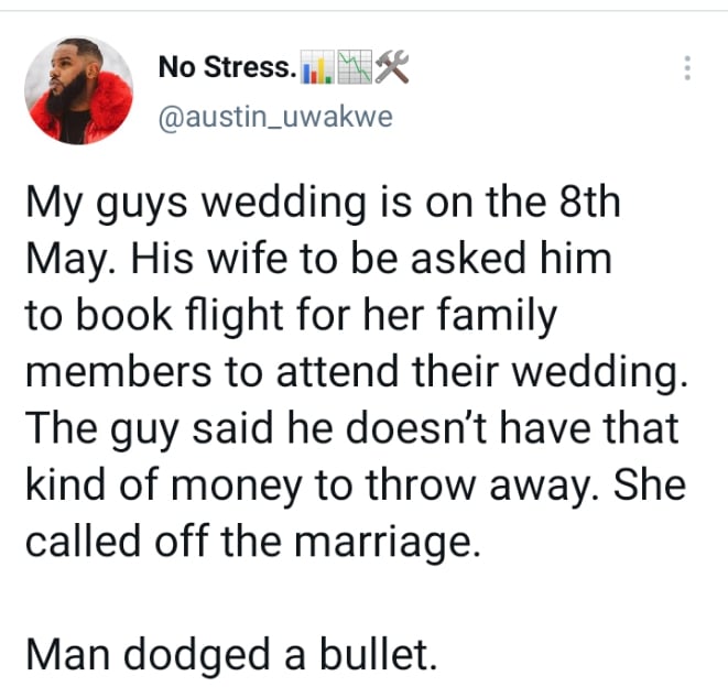 According to Austin who shared the story via twitter, his friend’s fiancee called off the wedding after her husband-to-be failed to book flight for her family members.
