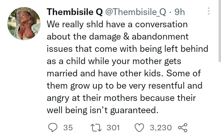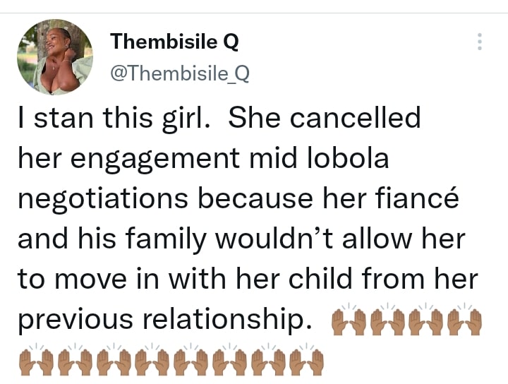 “I stan this girl. She cancelled her engagement mid lobola negotiations because her fiance and his family wouldn’t allow her to move in with her child from her previous relationship.”