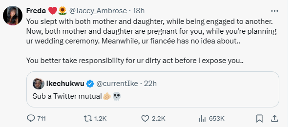 “You slept with both mother and daughter, while being engaged to another. Now, both mother and daughter are pregnant for you, while you’re planning ur wedding ceremony. Meanwhile, ur fiancée has no idea about.. You better take responsibility for ur dirty act before I expose you..”