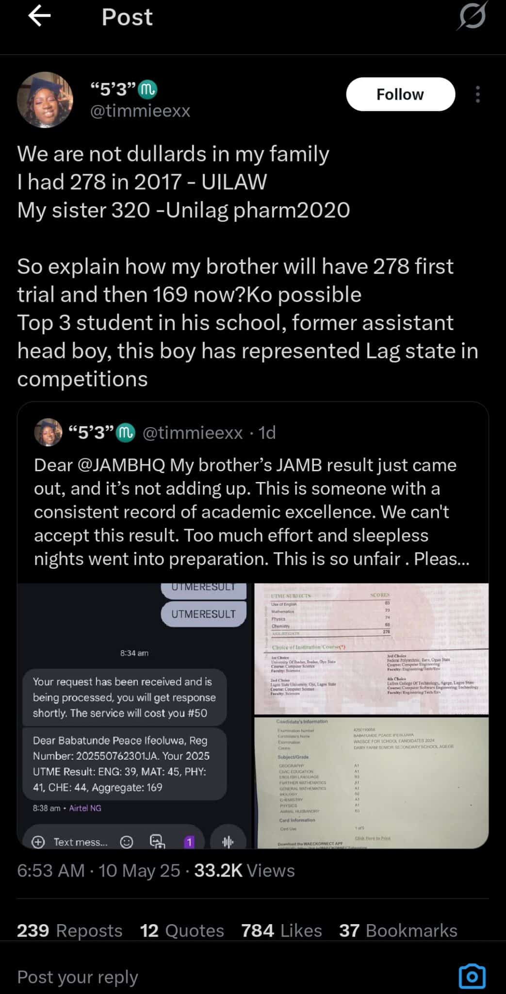 In a series of posts shared via her page on X (formerly Twitter), the lady expressed shock and disappointment after her brother, who reportedly scored 278 in his first UTME attempt, was told he scored 169 in the 2025 exam.