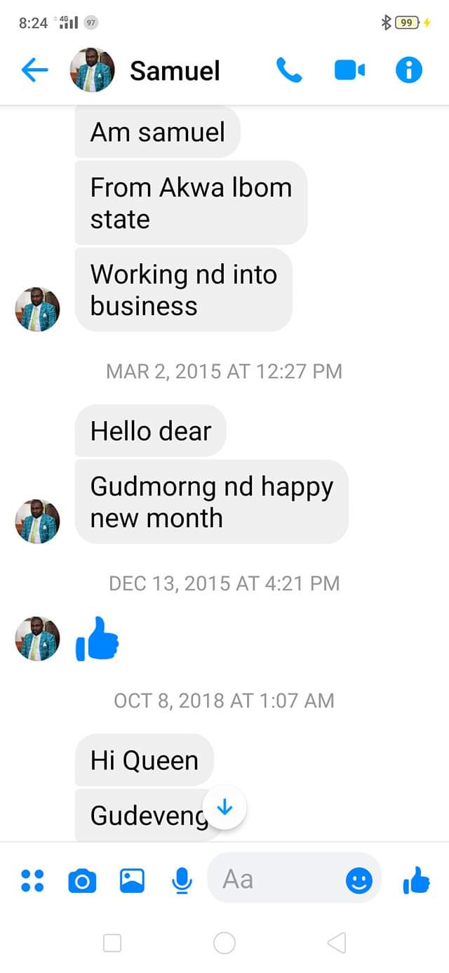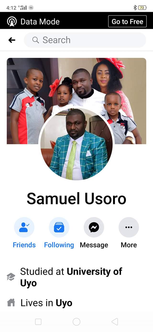 According to Obong-anwan, Samuel Usoro who has a photo of his family displayed as his cover photo on the social media platform has been in her inbox for years before trying to reach out to her via a video call while she was at wedding.