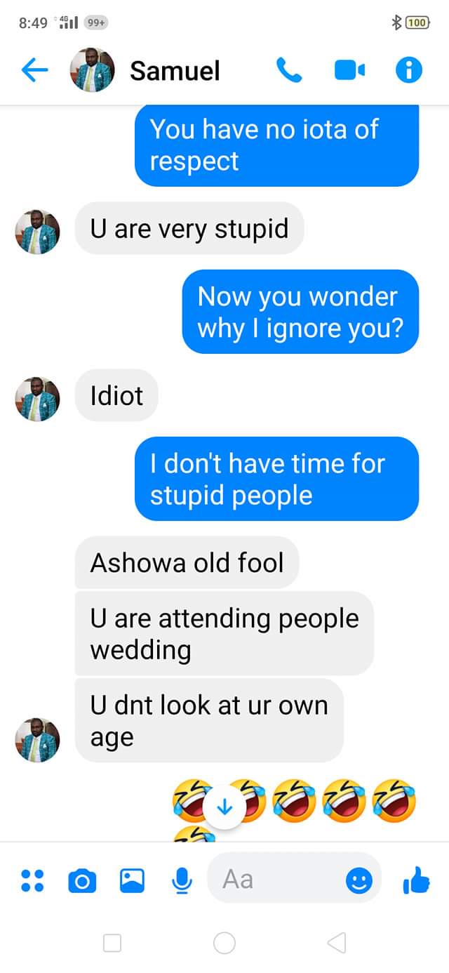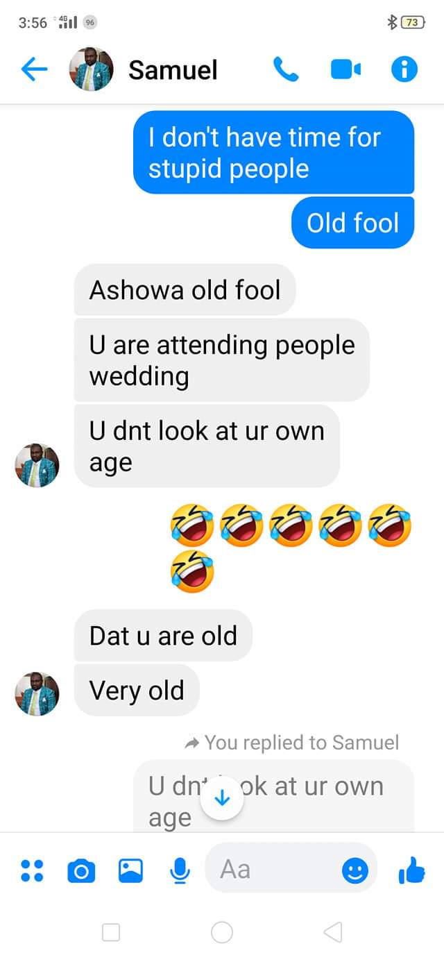 So I sent him a message of how stupid it was for him to call someone on video and not hang up when it was obvious the person wasn’t even there to respond. And next thing Hunku started showering me with insults.