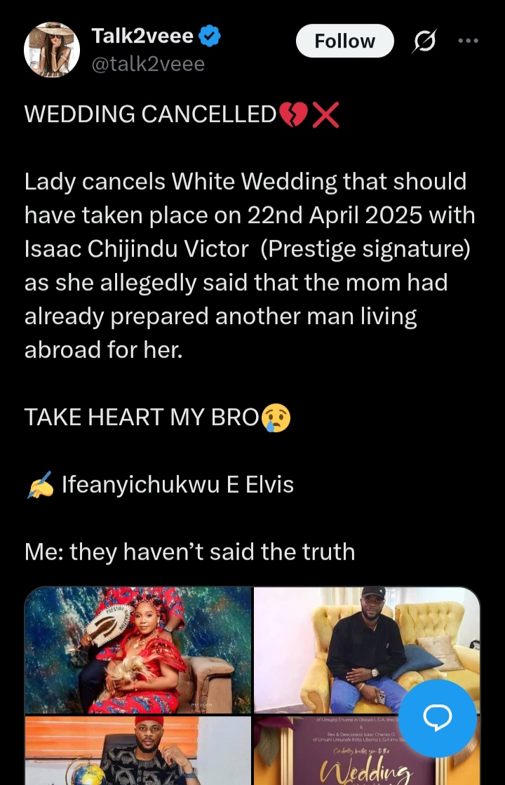 Lady cancels White Wedding that should have taken place on 22nd April 2025 with Isaac Chijindu Victor (Prestige signature) as she allegedly said that the mom had already prepared another man living abroad for her.