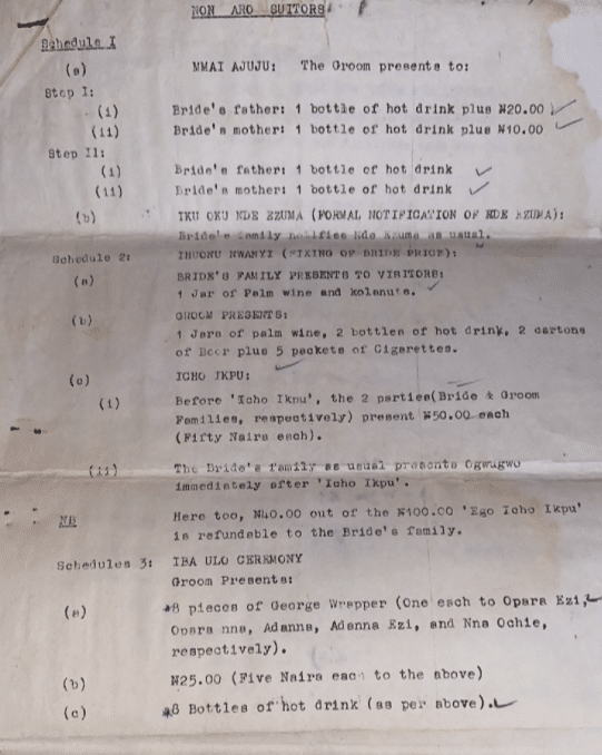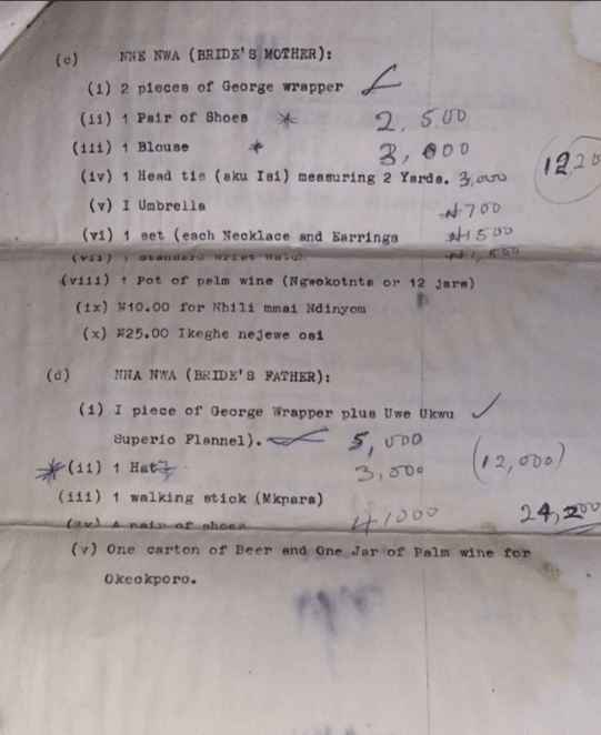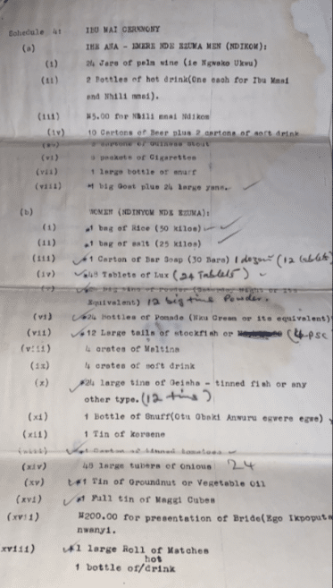 Amarachi mentioned that her mother hails from Abia State. The bride price list, which dates back to 2001, showcases the traditional customs and expectations for marriage in that region during that period.