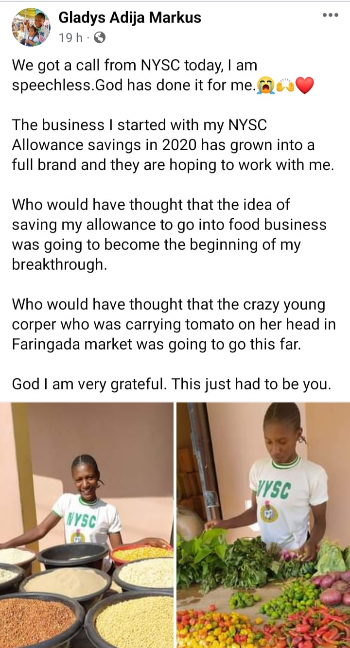 The Jos-based entrepreneur had gone viral after she shared her inspiring story of how she saved all her NYSC allowance to start a business with it.