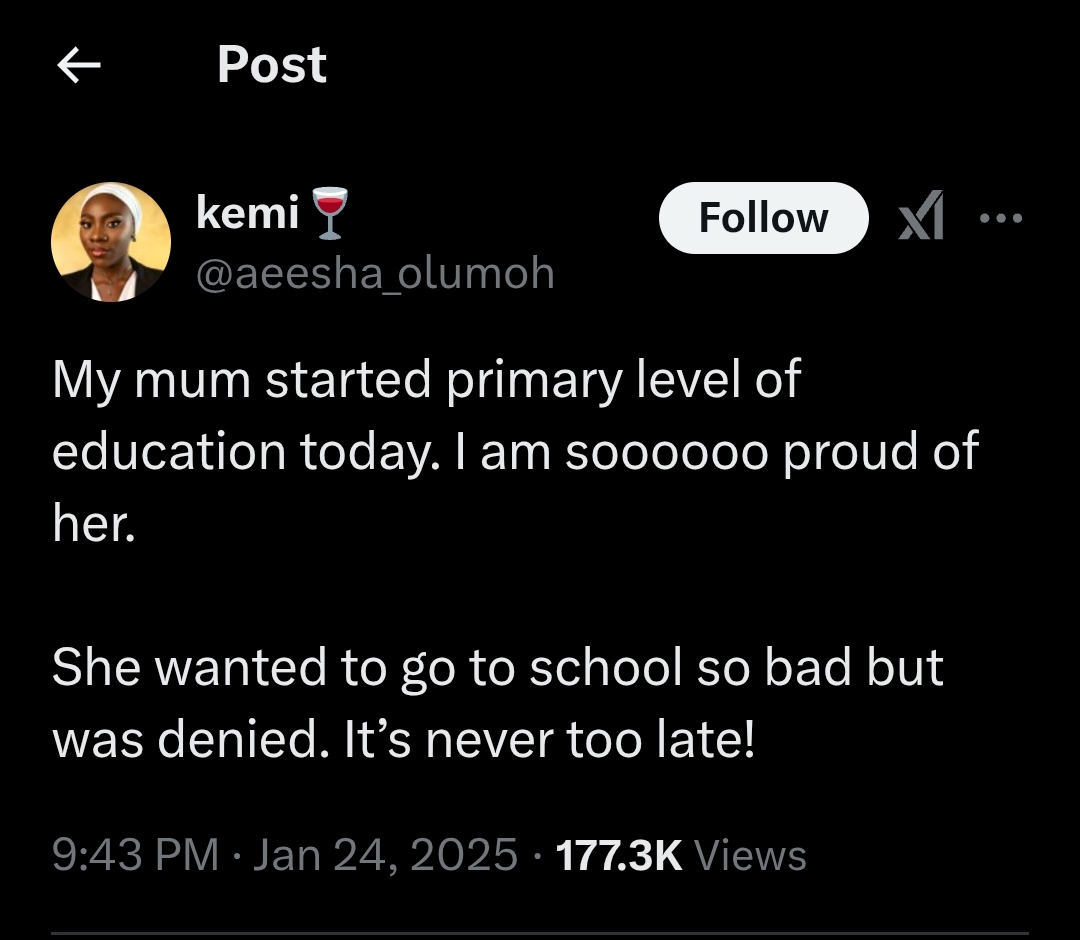 In a post on the popular social media platform X (formerly Twitter), the lady revealed her mother’s determination to pursue education despite the setbacks she faced in the past.