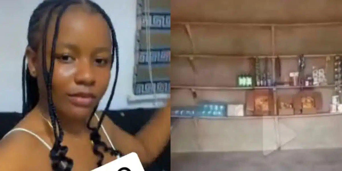 A Nigerian lady celebrates her achievement as she congratulates herself on allegedly opening a modest provision shop.