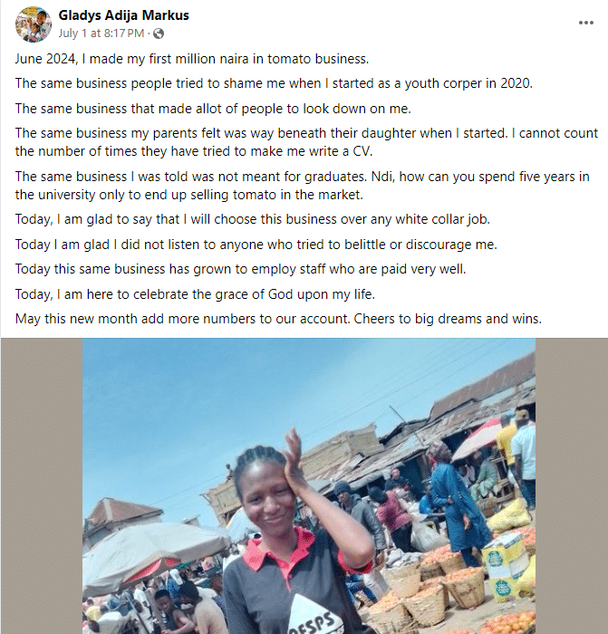 A Nigerian lady, Gladys Adija Markus, has taken to social media to share her journey of achieving her first million naira in June 2024 from selling tomatoes.