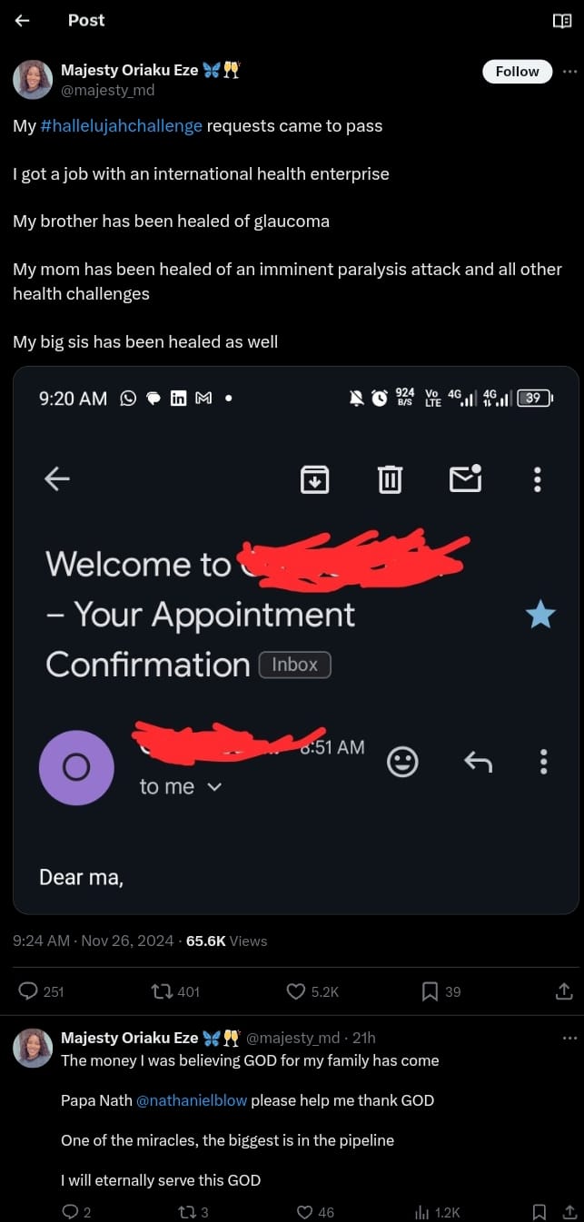 > “The money I was believing GOD for my family has come. Papa Nath @nathanielblow, please help me thank GOD. One of the miracles—the biggest—is in the pipeline. I will eternally serve this GOD.”
