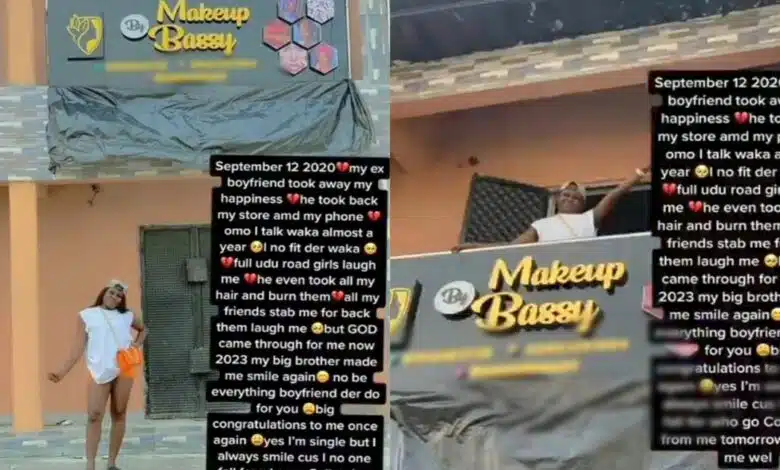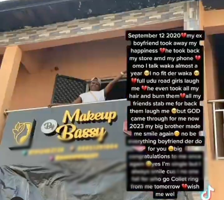 “September 12 2020 my ex boyfriend took away my happiness Whe took back my store amd my phone omo I tak waka almost a year i no fit der waka full udu road girls laugh me. He even took all my hair and burn them all my friends stab me for back them laugh me but GOD came through for me now 2023 my big brother made me smile again no be everything boyfriend der do for you. big congratulations to me once again yes I’m single but I always smile cus I no one fall for who go Collet ring from me tomorrow wish”