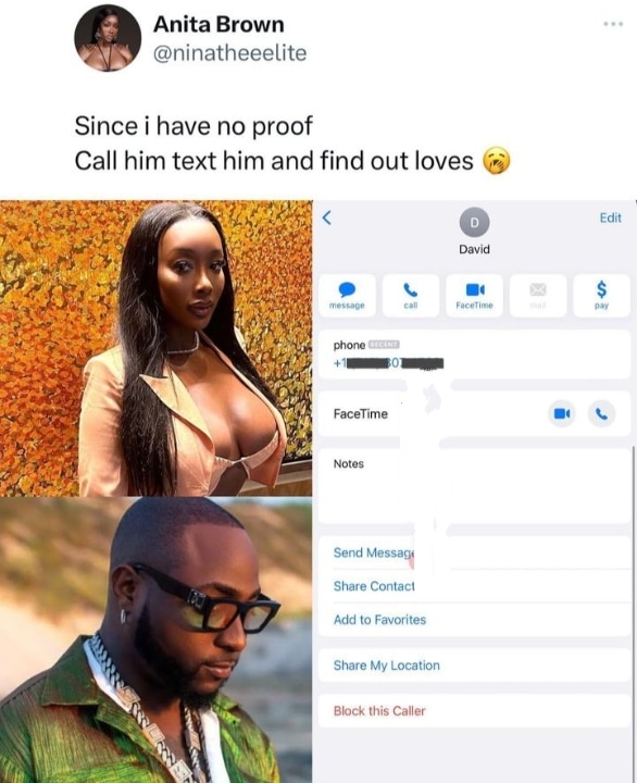 Anita, while responding to critics lambasting her over her allegation against Davido, dropped his contact and asked netizens to ask him questions.