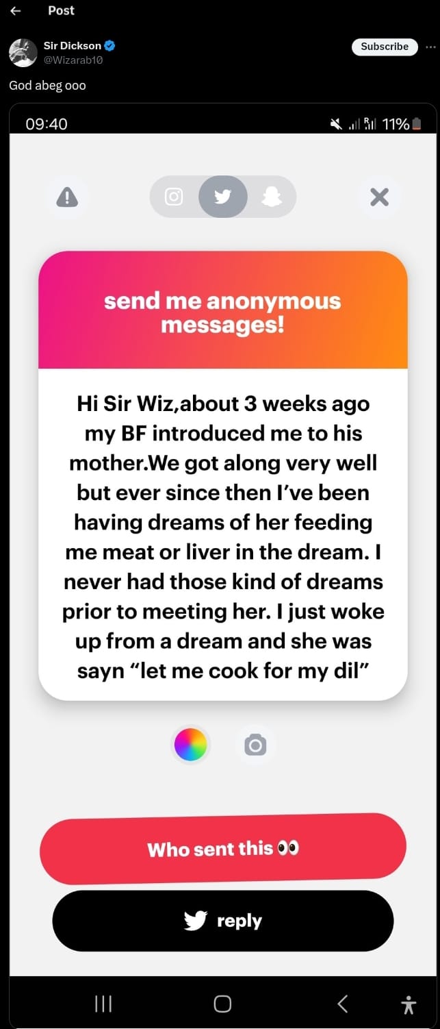 Lady claims she was fed meat and liver by boyfriend’s mother in her sleep, seeks advice