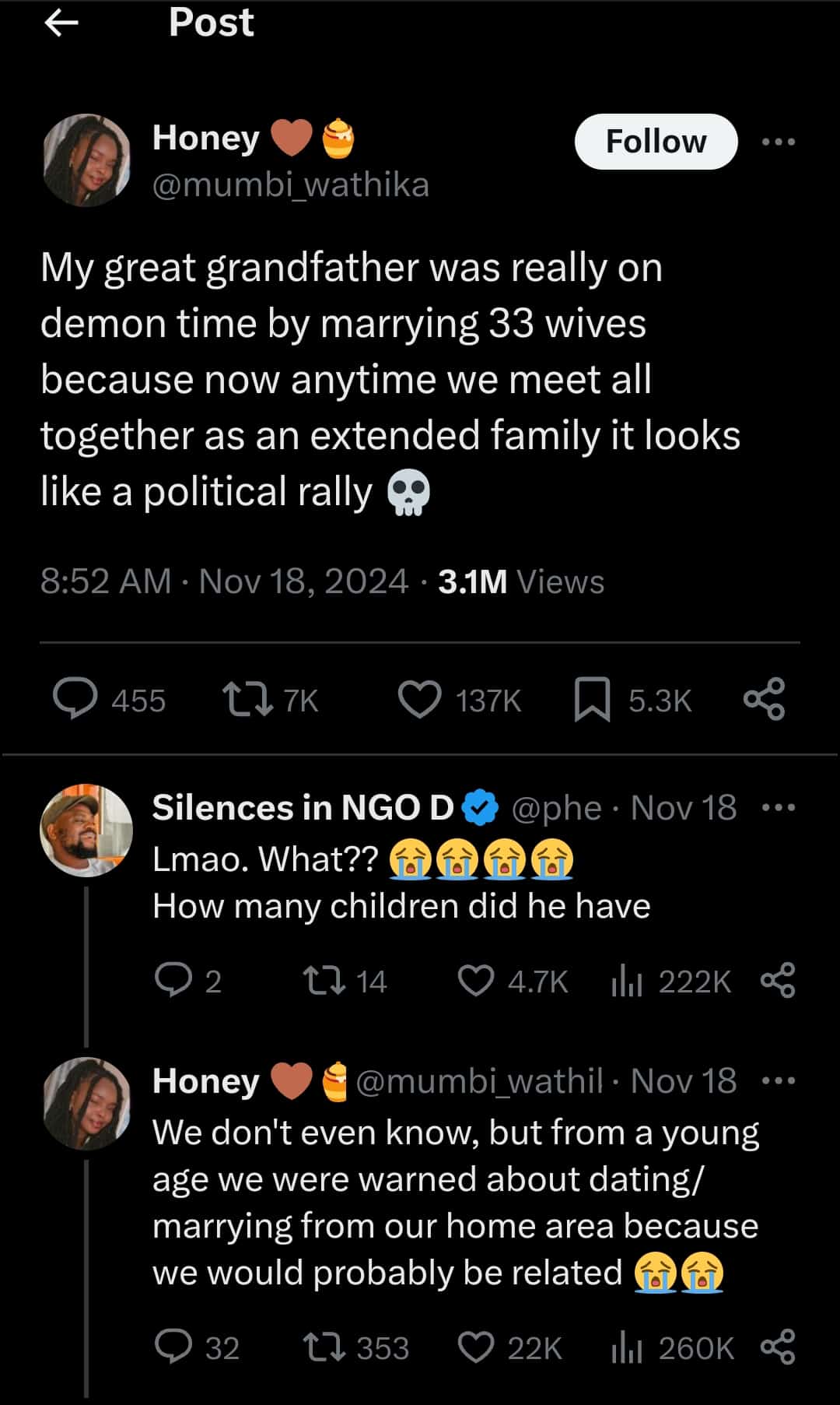 A lady shocks the internet as she compares her family to a political party, reveales her grandfather has 33 wives and that she has lost count of the children he has.