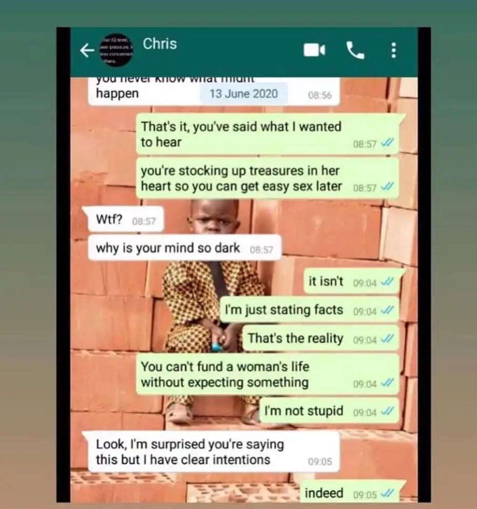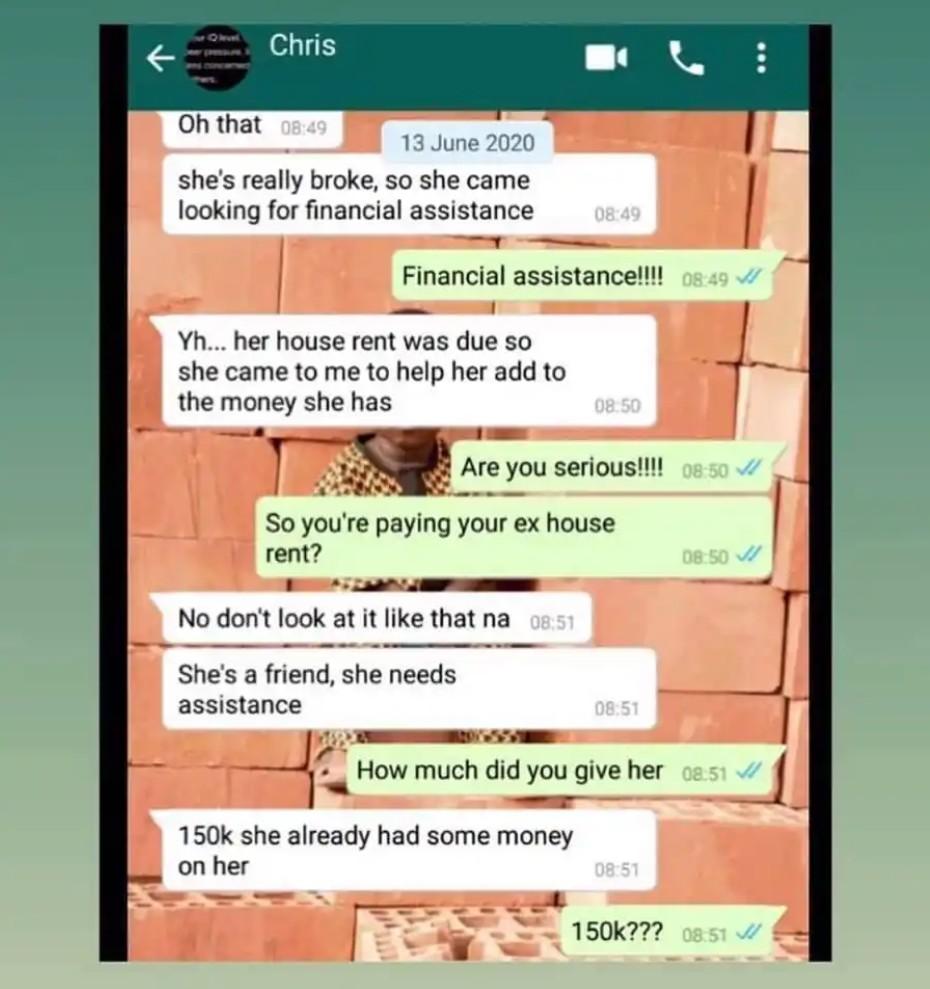 A screenshot of the conversation between the two revealed that the boyfriend assisted his ex with N150k for her house rent whie he has never given her such amount.