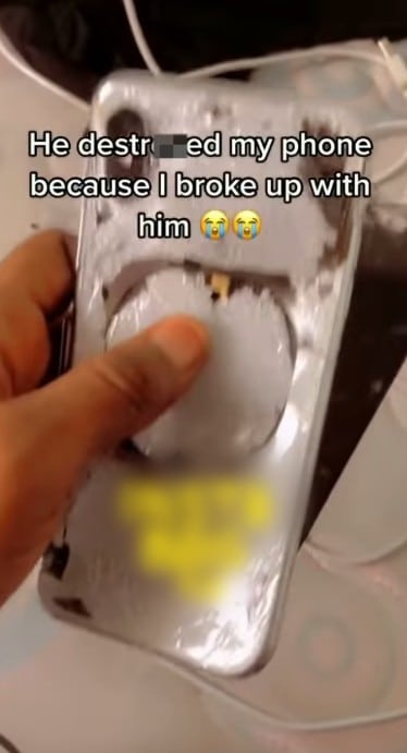 In a video the heartbroken lady shared, she could be heard sniffling and crying silently as she showed of her completely ruined iphone which her boyfriend smashed.