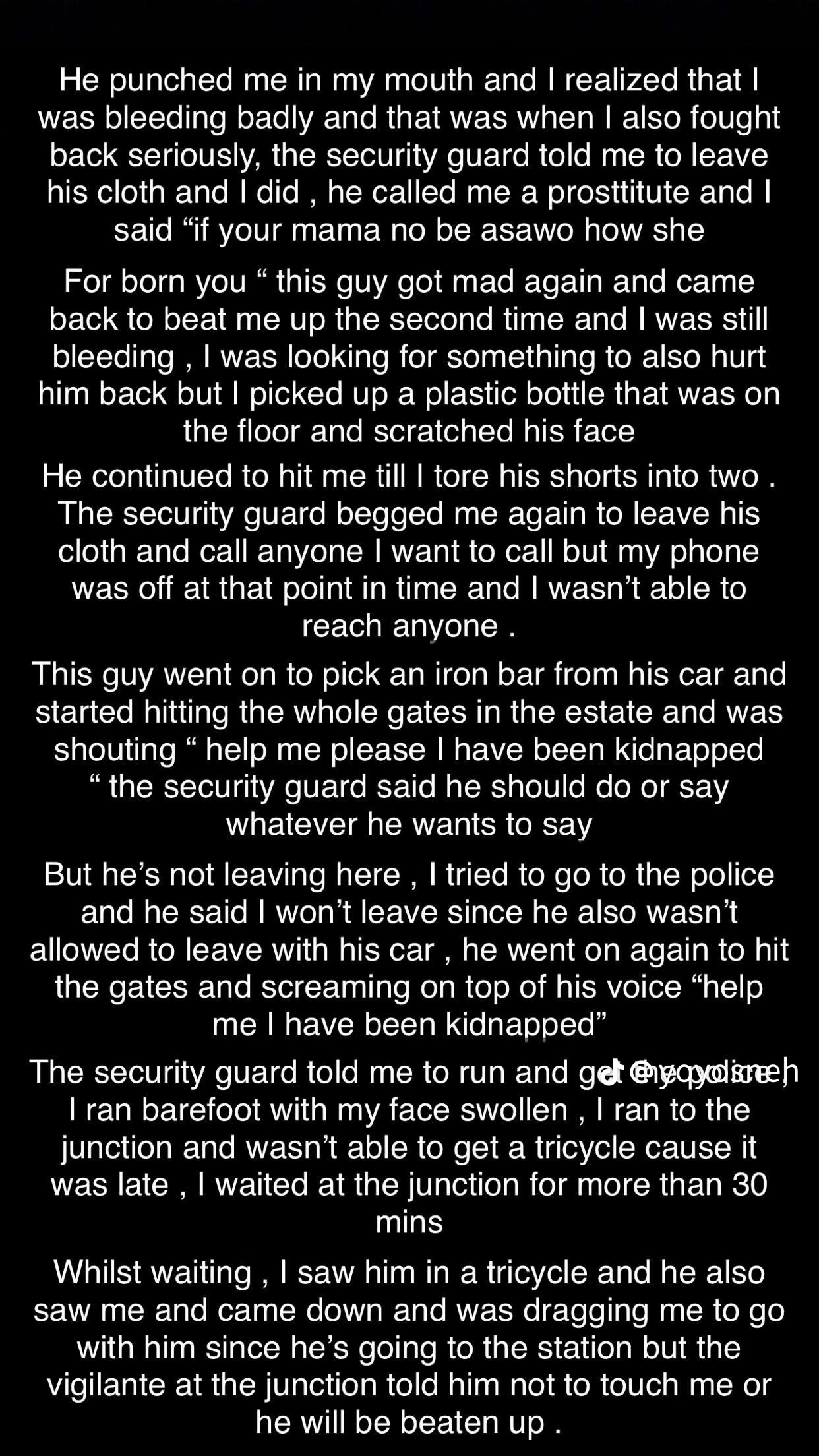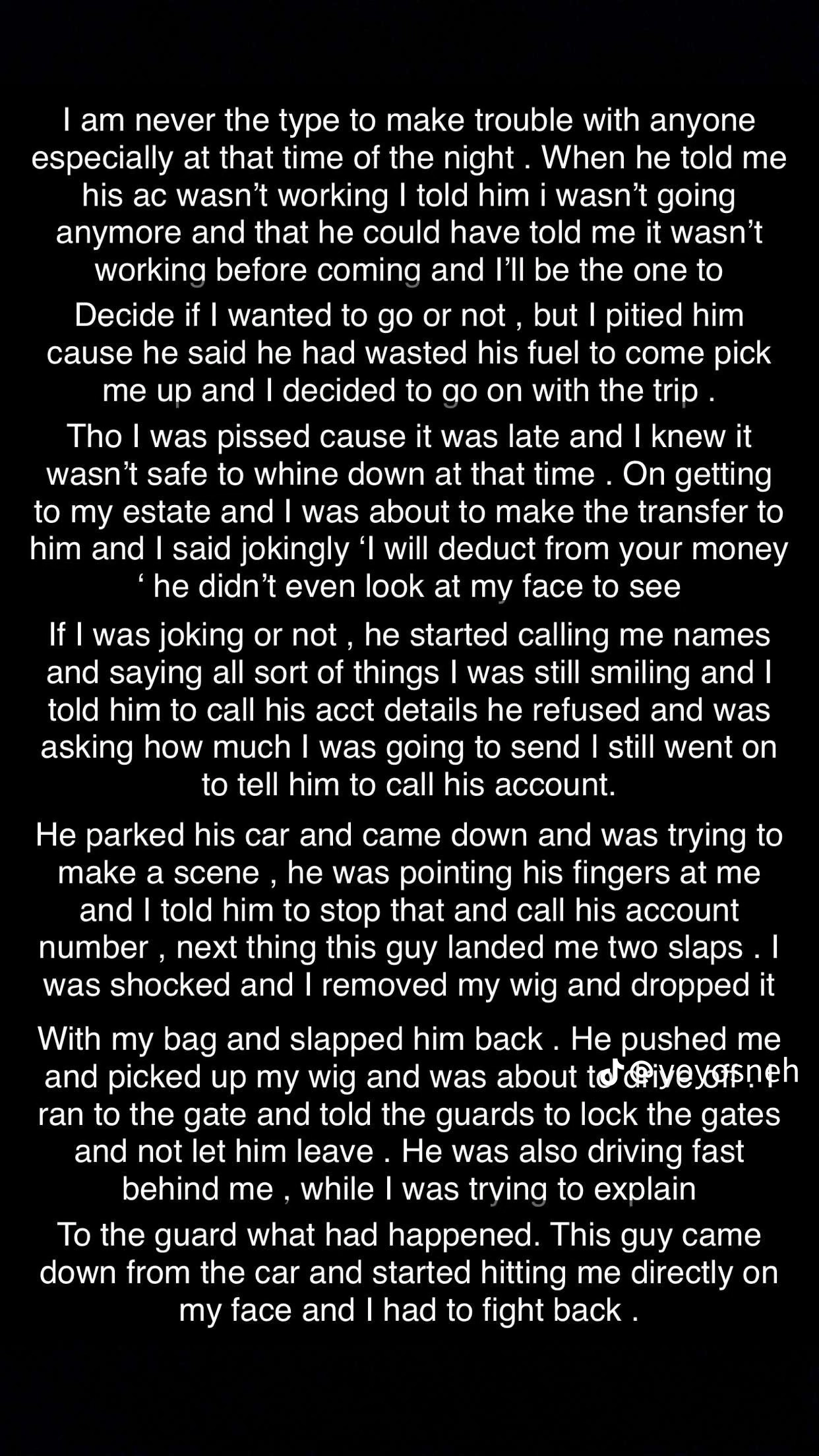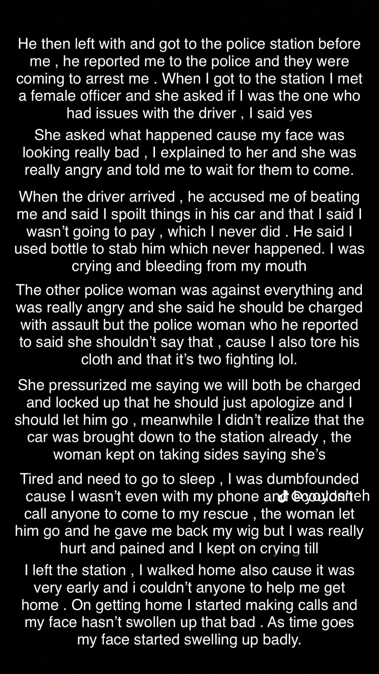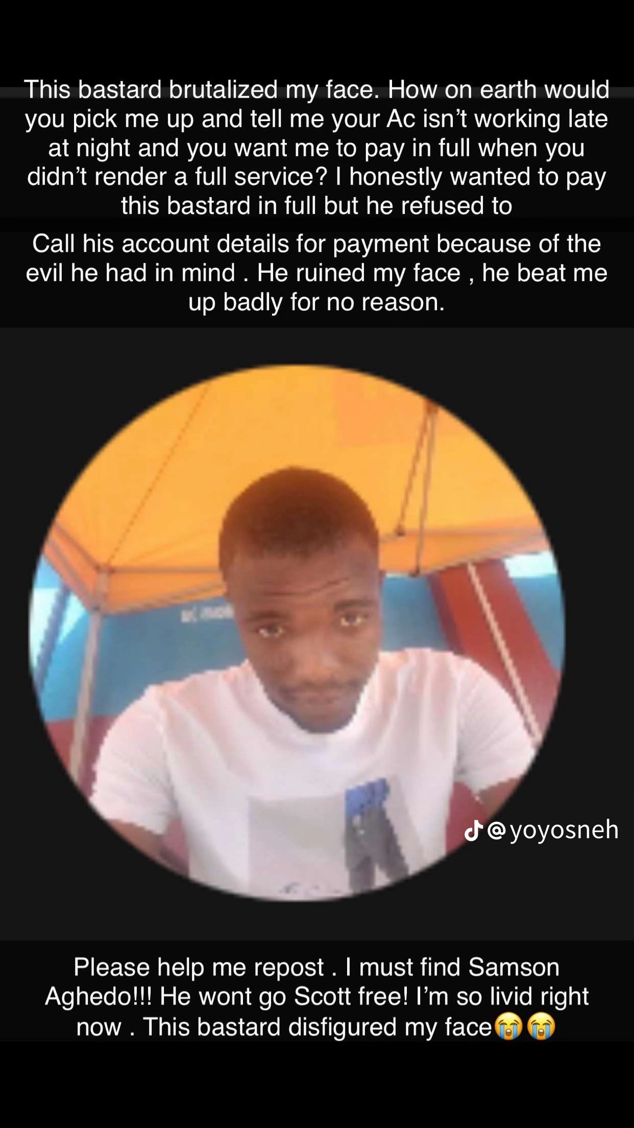 “I’m so angry because I was never rude to him — he’s just a wicked man. He’s a beast! How can you pick me up, tell me your AC isn’t working late at night, still expect full payment, and then beat me up for no reason? I was even ready to pay in full, but he refused to call his account number just because he already had evil intentions.”