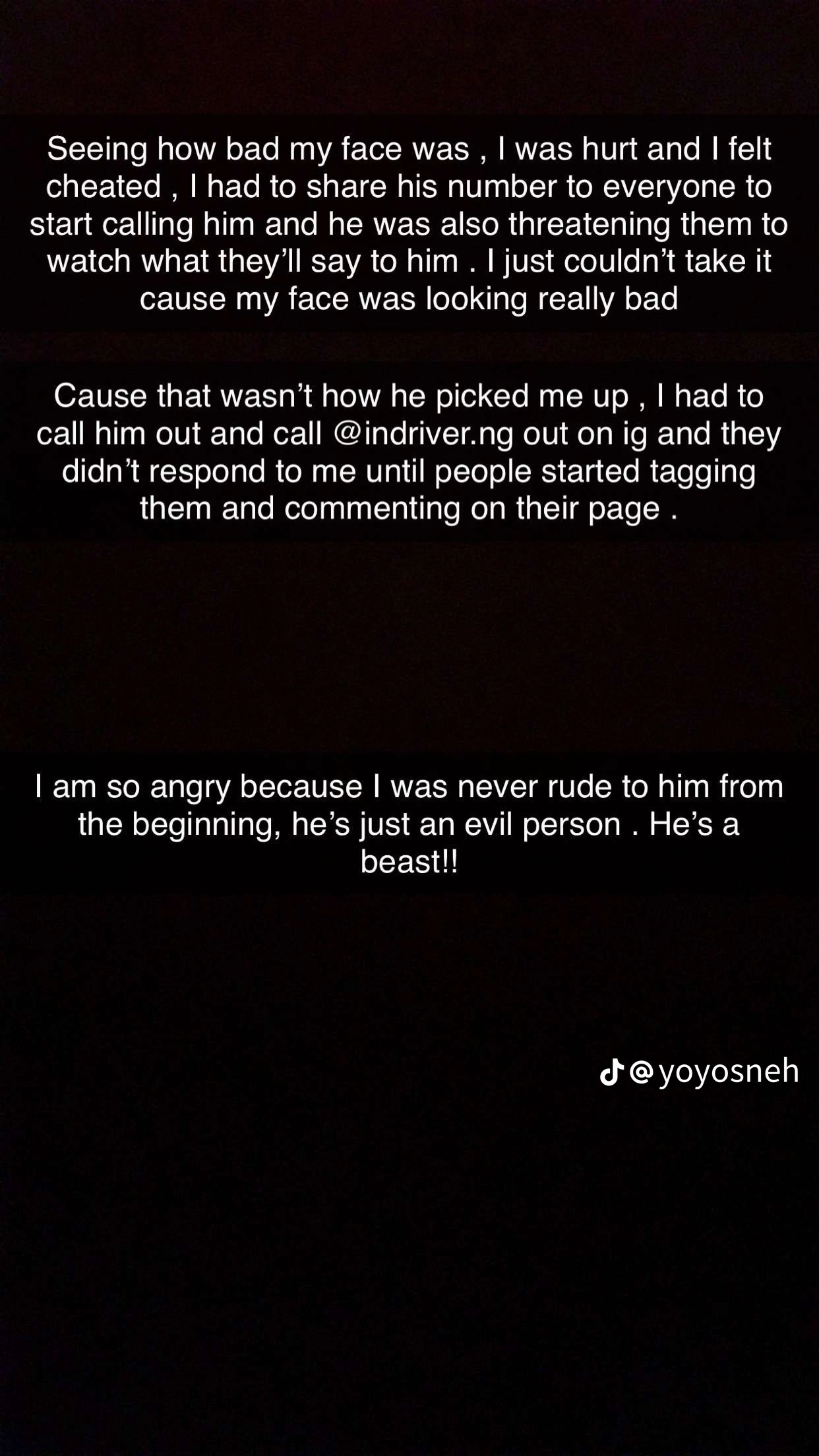 “I eventually called out both the driver and @indriver.ng on Instagram, but they ignored me until people started tagging them and leaving comments on their page.”
