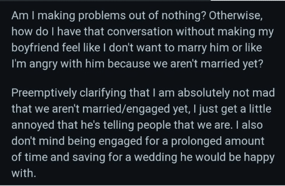 “Am I making problems out of nothing? Otherwise, how do I have that conversation without making my boyfriend feel like I don’t want to marry him or like I’m angry with him because we aren’t married yet?Preemptively clarifying that I am absolutely not mad that we aren’t married/engaged yet, I just get a little annoyed that he’s telling people that we are. I also don’t mind being engaged for a prolonged amount of time and saving for a wedding he would be happy with.”