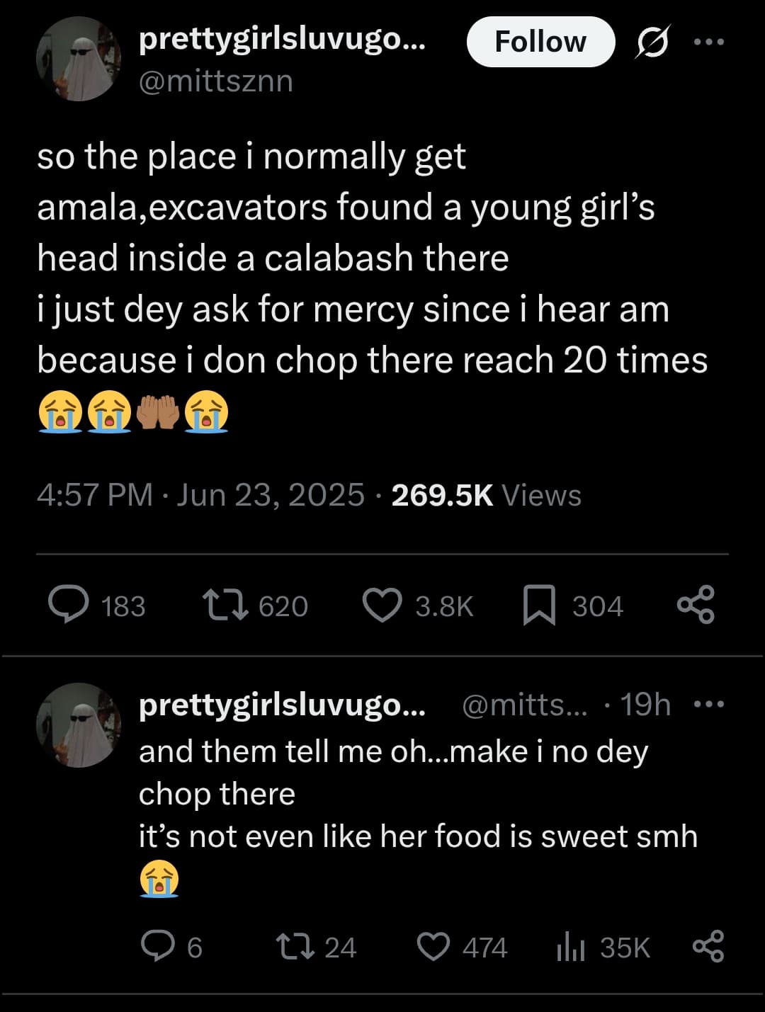 She wrote: “So the place I normally get amala, excavators found a young girl’s head inside a calabash there. I just dey ask for mercy since I hear am because I don chop there reach 20 times😭😭🤲🏾😭.”