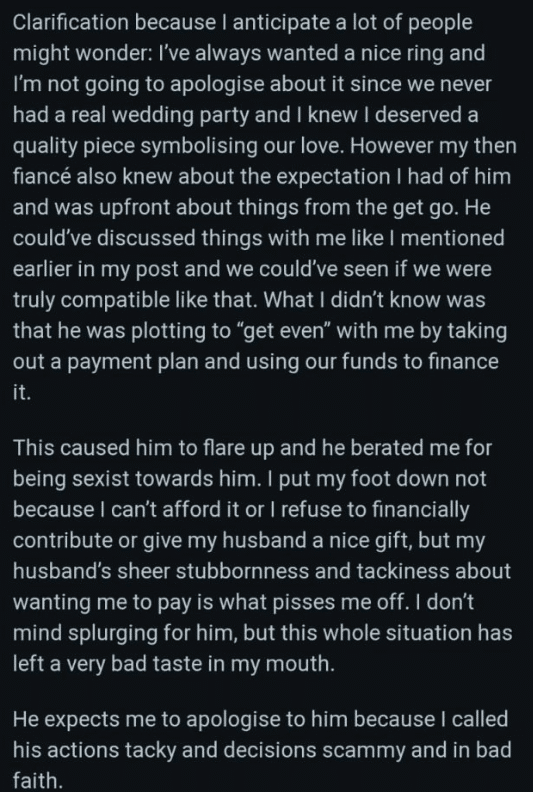 She emphasized that the engagement ring should be considered a gift in line with cultural norms and criticized her husband’s decision to make her contribute towards its cost.