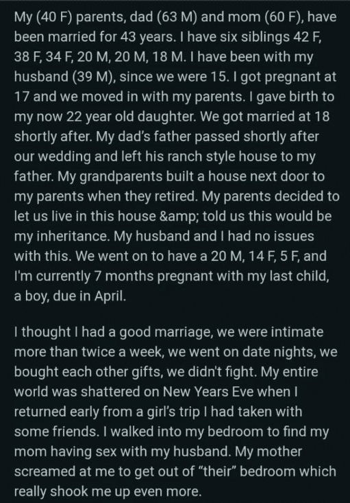 I thought I had a good marriage, we were intimate more than twice a week, we went on date nights, we bought each other gifts, we didn’t fight. My entire world was shattered on New Years Eve when I returned early from a girl’s trip I had taken with some friends. I walked into my bedroom to find my mom having sex with my husband. My mother screamed at me to get out of “their” bedroom which really shook me up even more.