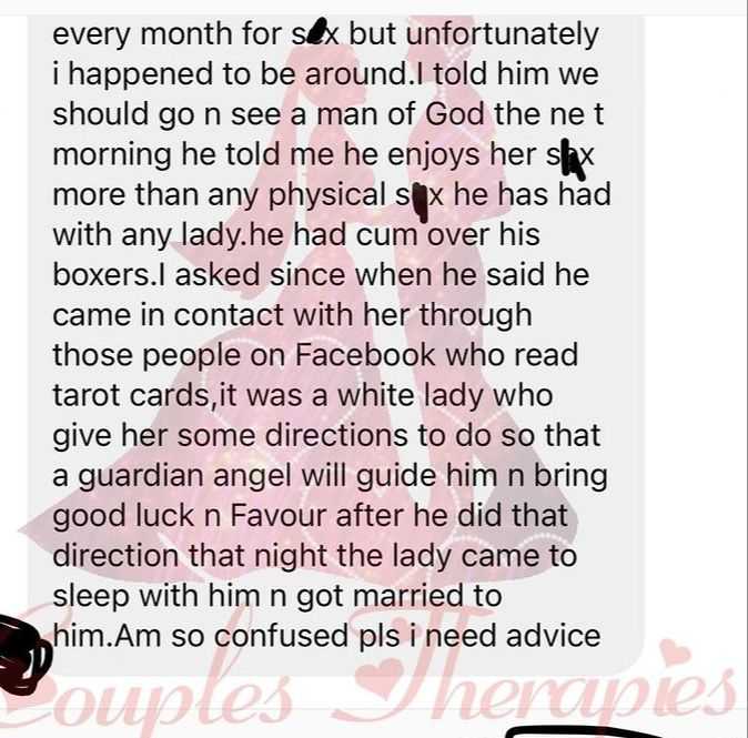 “Something strange happened last nyt I woke in the middle of the night n saw my fiancé twisting n whining his waist just as having sxx ,I tapped him for almost 10mins he was still doing that all of a sudden he woke up n I asked him what he was doing, he said he is making love to his spiritual wife, then I asked him what kind of spiritual wife like how, he said she comes twice every month for sxx but unfortunately i happened to be around.) told him we should go n see a man of God the next morning he told me he enjoys her sxx more than any physical sxx he has had with any lady. he had cum over his boxers. I asked since when he said he came in contact with her through those people on Facebook who read tarot cards, it was a whyte lady who give her some directions to do so that a guardian angel will guide him n bring good luck n Favour after he did that direction that night the lady came to sleep with him n got married to him. Am so confused pls i need advice.”