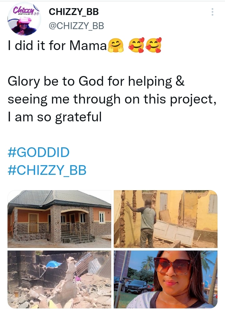 Chizzy said that she built the house for her mum and thanked God for making it possible for her to complete the building project.