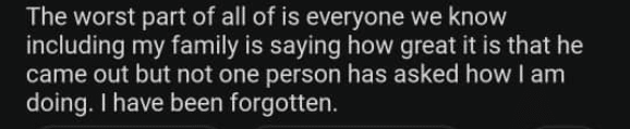The worst part of all of is everyone we know including my family is saying how great it is that he came out but not one person has asked how I am doing. I have been forgotten.”