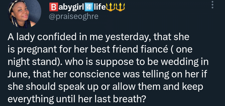 “A lady confided in me yesterday, that she is pregnant for her best friend fiancé ( one night stand). who is suppose to be wedding in June, that her conscience was telling on her if she should speak up or allow them and keep everything until her last breath?”