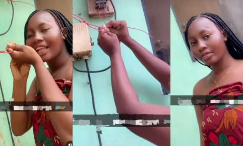 A Nigerian lady proudly showcases her female friend’s impressive electrical skills as she effectively resolves lighting issues in their hostel.