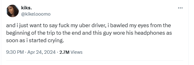 The lady known as @kikelooomo revealed that she had booked an Uber ride and, for some reason best known to her, began crying in the Uber ride.