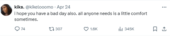 i hope you have a bad day also. all anyone needs is a little comfort sometimes,” she wrote.