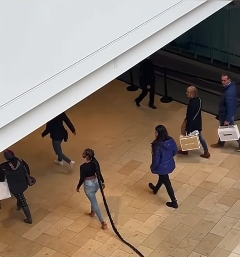 A fashionista drew curious stares at a mall after she stormed the location with a floor-length braid.