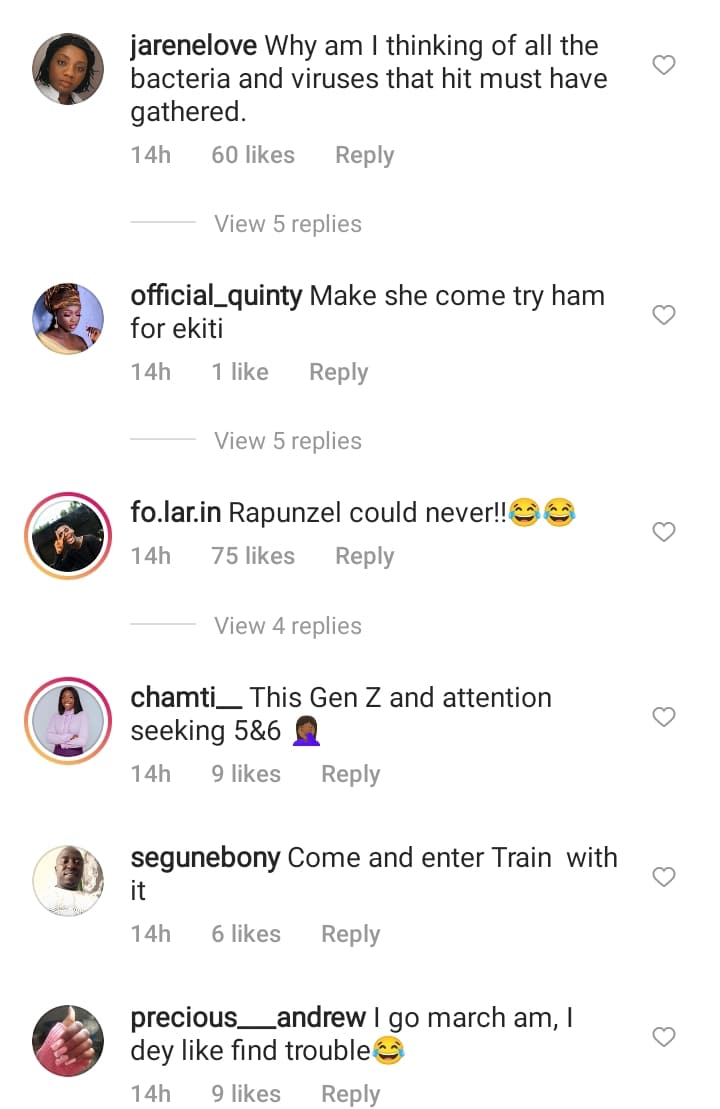 In the video shared online, the lady could be seen cat walking as the braid trailed behind, drawing curious and puzzled looks from people.
