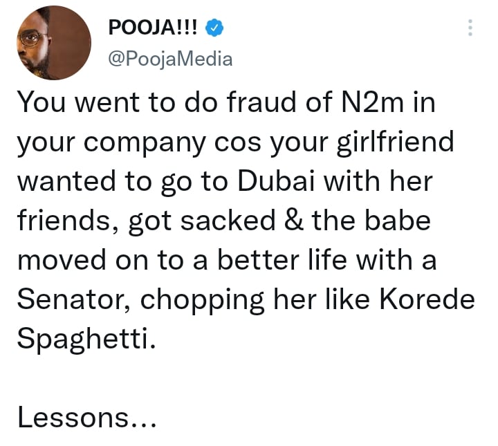 “You went to do fraud of N2m in your company cos your girlfriend wanted to go to Dubai with her friends, got sacked & the babe moved on to a better life with a Senator, chopping her like Korede Spaghetti.