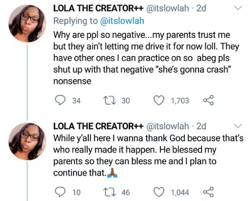 Lola who shared adorable photos of herself and her new expensive whip garnered attention on Twitter after her post generated thousand of Likes and Retweets.