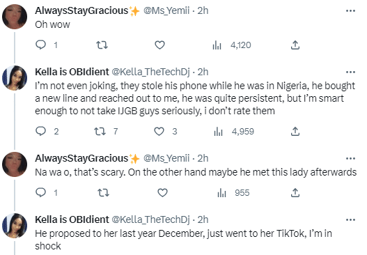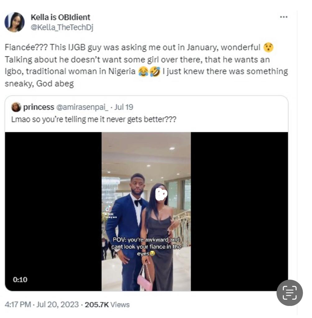 In a series of posts made on her Twitter page, she said that the man had gotten engaged to his fiancée in 2022 December, but had commenced courting her in January 2023.