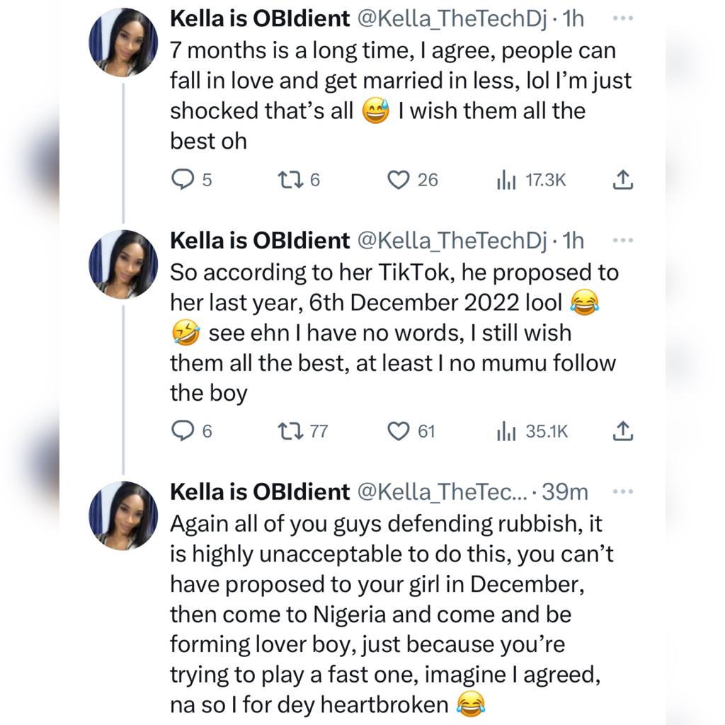 A Nigerian lady, Kella has gone online to call out a man who got engaged in December but was wooing her the following month.