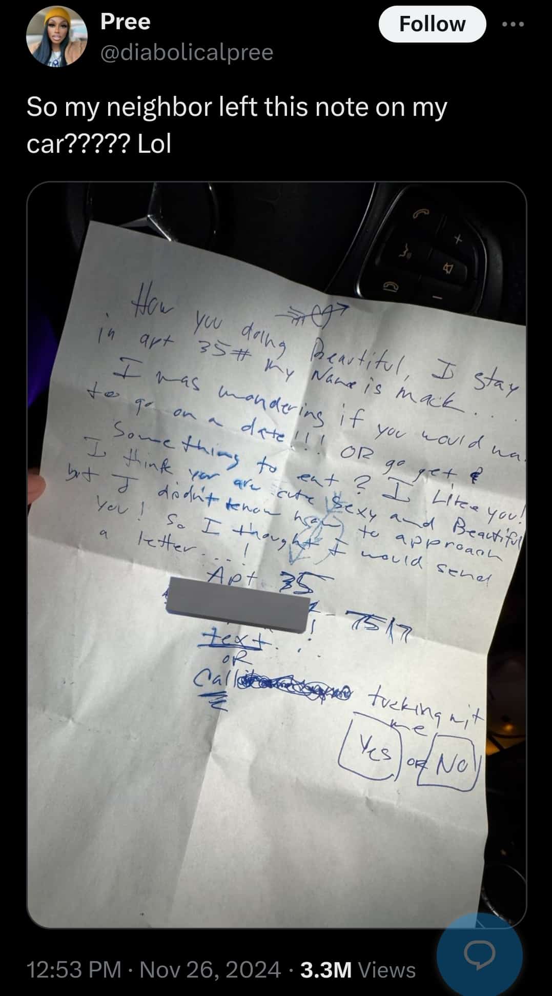 According to her post, the neighbor left the note on her car, expressing his interest in her.