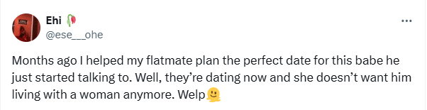 The lady known on X as @ese___ohe took to the micro-blogging site to reveal how she had helped her flatmate with his girlfriend.