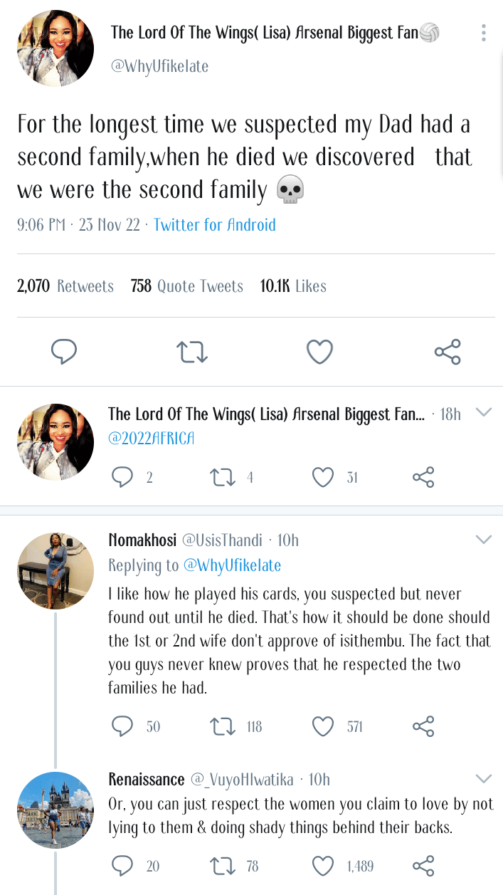 “I like how he played his cards, you suspected but never found out until he died. That’s how it should be done should the 1st or 2nd wife don’t approve of isithembu. The fact that you guys never knew proves that he respected the two families he had Or, you can just respect the women you claim to love by not lying to them & doing shady things behind their backs.”