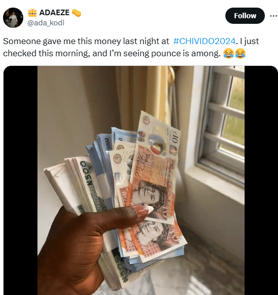 “Someone gave me this money last night at #CHIVIDO2024. I just checked this morning, and I’m seeing pounce is among. 😂😂,” she wrote.