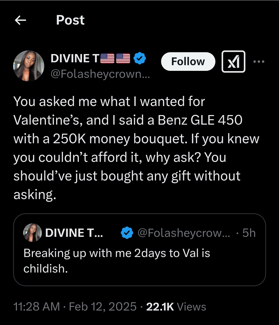 “Breaking up with me two days to Valentine’s is childish. You asked me what I wanted, and I told you—a Benz GLE 450 with a ₦250K money bouquet. If you knew you couldn’t afford it, why ask? You should’ve just bought any gift without asking.”