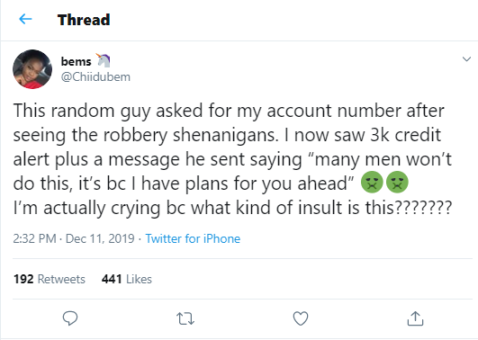 “This random guy asked for my account number after seeing the robbery shenanigans. I now saw 3k credit alert plus a message he sent saying “many men won’t do this, it’s bc I have plans for you ahead” I’m actually crying bc what kind of insult is this???????”