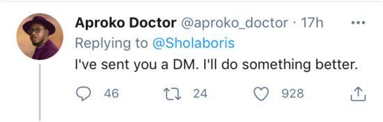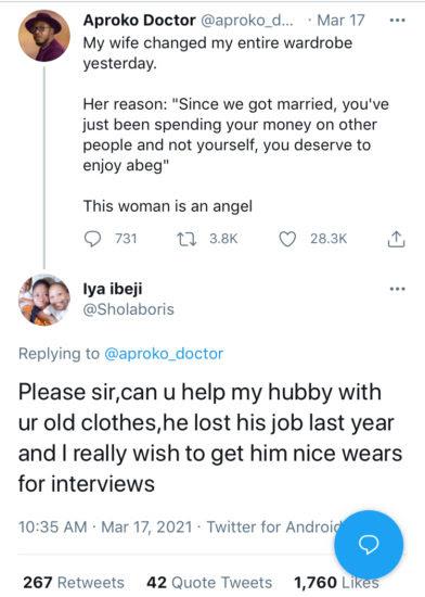 In a Twitter exchanger, @sholaboris begged popular influencer, Aproko Doctor of his old clothes while narrating how her husband lost his job.