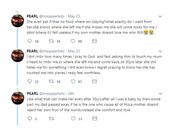@misspearlisto tweeted: “My mom left me with my dad in 1989,nd she never return,my dad passed away in 1997,and I hv to stay with relatives,so last week someone saw her and ask for her numbers so that i can call her,,I was so happy,I called her immidiately,she replied and say”pls dnt call me again”
