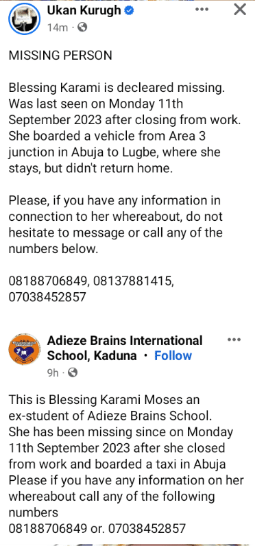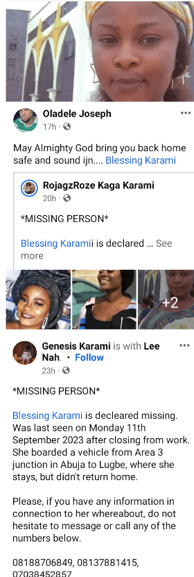 A lady identified as Blessing Karami Moses has been declared missing in the Nigerian capital of Abuja.