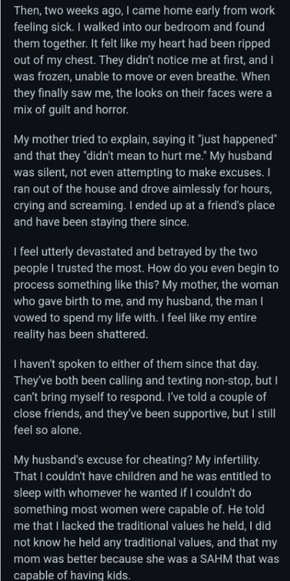“I can’t believe I’m actually typing these words, but I need to get this off my chest. My (26F) husband (34M) is having an affair with my mother (57F), and I feel like my entire world is crashing down around me.