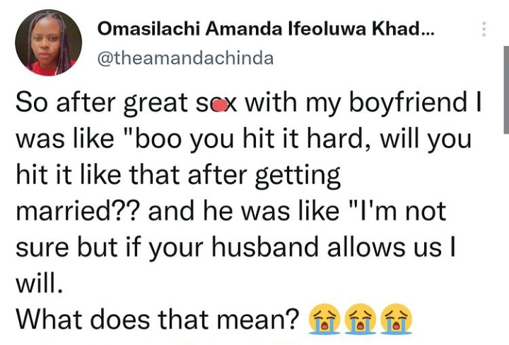 Taking to the micro-blogging to narrate her sad situation, she wrote: “So after great sex with my boyfriend I was like “boo you hit it hard, will you hit it like that after getting married?? and he was like “I’m not sure but if your husband allows us I will. What does that mean? ???.”